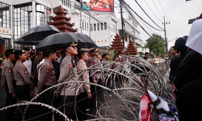 Massa mulai bergerak menuju kantor DPRD Jatim sekitar pukul 13.33 WIB. Setibanya di lokasi, mereka mendapati pengamanan ketat dengan kawat berduri terpasang di pintu gerbang. Aparat kepolisian berjaga di sejumlah titik, termasuk satu unit mobil water canon yang disiagakan di sisi gedung.