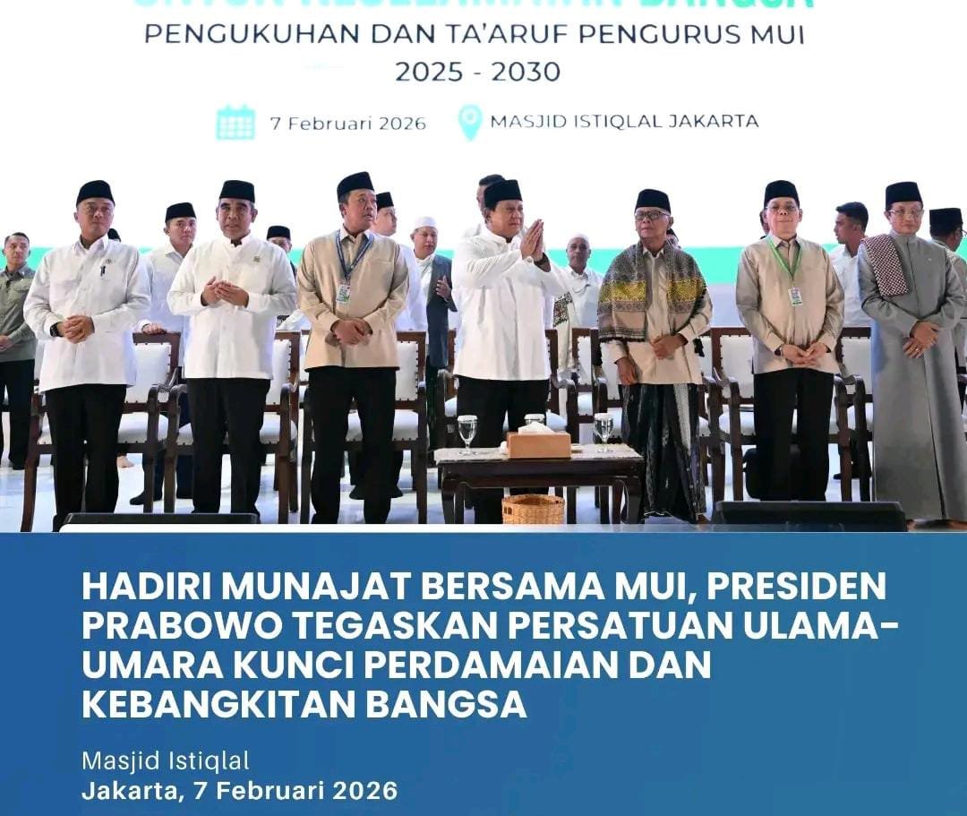 Jakarta — Presiden Republik Indonesia, Prabowo Subianto, menghadiri acara Bersatu dalam Munajat untuk Keselamatan Bangsa yang dirangkaikan dengan Pengukuhan dan Ta’aruf Pengurus Majelis Ulama Indonesia (MUI) Masa Khidmat 2025–2030 di Masjid Istiqlal, Jakarta, Sabtu (7/2). Kehadiran Presiden menjadi simbol kuat komitmen pemerintah dalam memperkuat nilai-nilai spiritual dan kebangsaan.