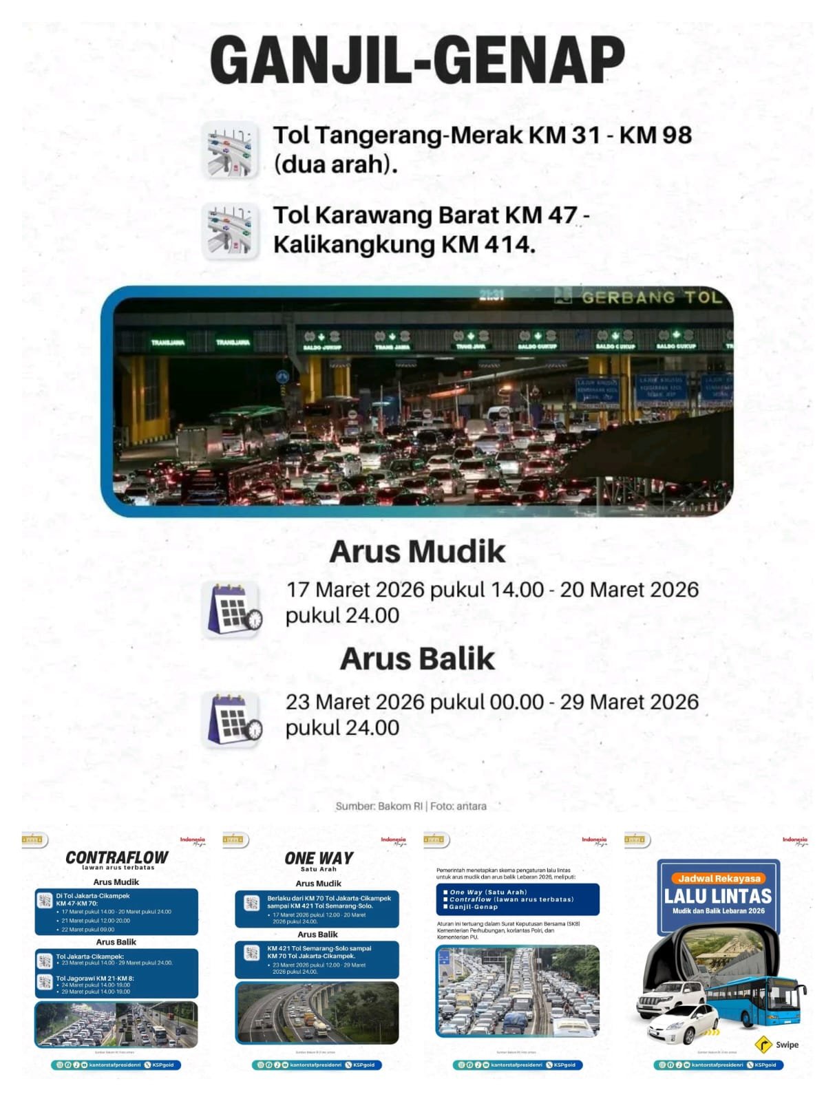 Beragam rekayasa lalu lintas akan diterapkan, mulai dari one way, lajur pasang surut (contra flow), hingga sistem ganjil-genap pada ruas tertentu. Langkah ini bertujuan memberi perjalanan yang lebih nyaman, aman, dan tertib bagi pemudik. Pemerintah mengimbau masyarakat untuk selalu memperhatikan informasi arus lalu lintas dan mengikuti ketentuan yang berlaku.