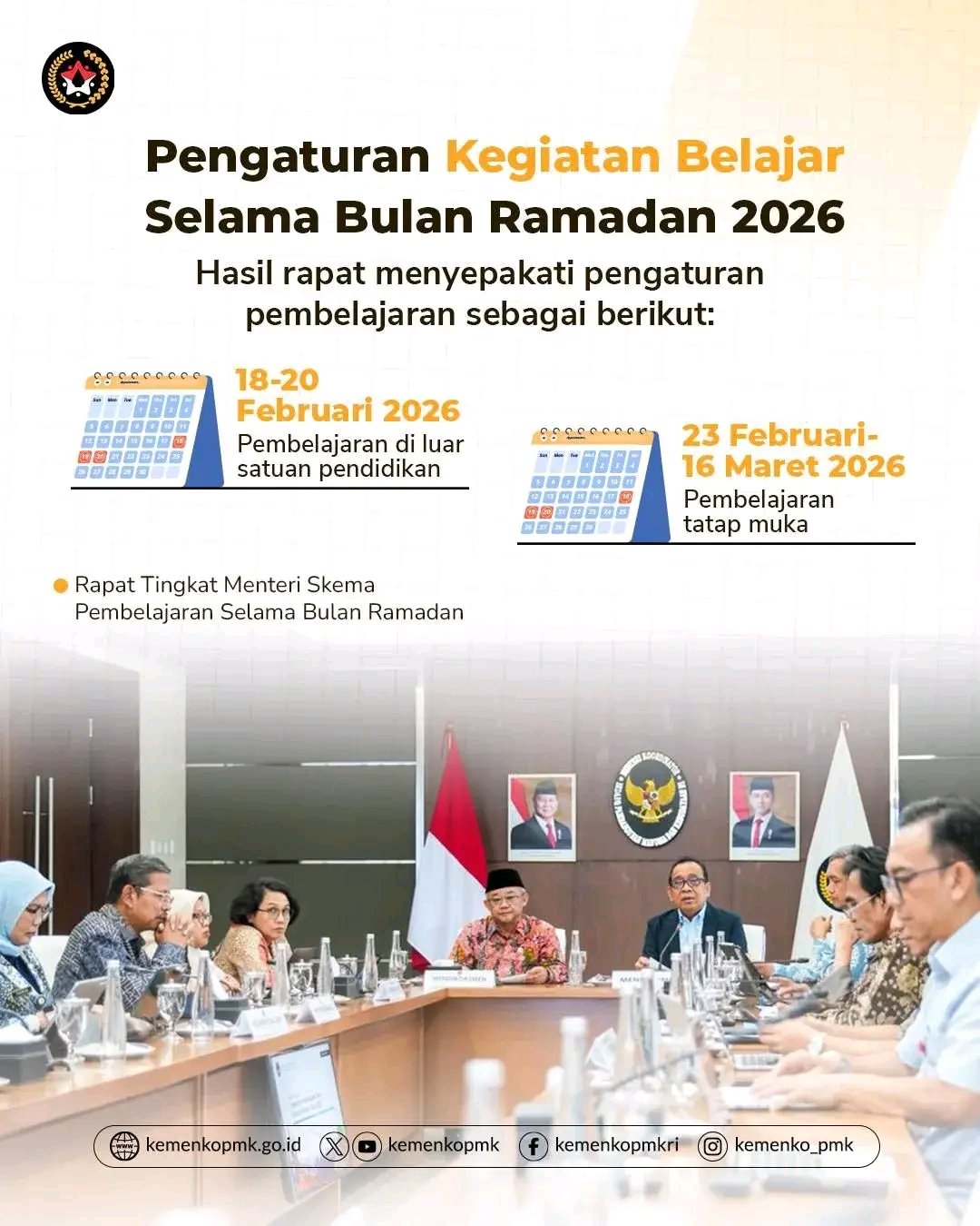 Pemerintah menetapkan skema pembelajaran selama Bulan Ramadan 2026 dengan pendekatan yang menyeimbangkan kekhusyukan ibadah dan keberlanjutan proses pendidikan. Kebijakan ini disepakati melalui rapat koordinasi lintas kementerian sebagai upaya menghadirkan sistem pembelajaran yang lebih manusiawi dan bermakna bagi peserta didik.